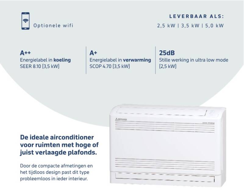 Het SRF single-split vloermodel van Mitsubishi Heavy Industries is de ideale Airconditioner voor ruimten met hoge of juist verlaagde plafonds. Met haar compacte afmetingen en tijdloos design past dit type probleemloos in ieder interieur. Het vloermodel wordt standaard geleverd met een draadloze infrarood afstandsbediening. Hiermee regelt u de instellingen van de unit, zoals temperatuur, ventilatorsnelheid, verwarming of koeling. De controller heeft een gebruiksvriendelijk ontwerp met grote knoppen. Er zijn veel belangrijke voordelen, zoals eco-modusinstellingen, waarmee energie kan worden bespaard. Er is ook een weektimer die naar wens kan worden ingesteld op uw eigen parameters. Er is ook een optie voor de stille modus, die kan worden geselecteerd wanneer u gaat slapen, zodat er minimale geluidsniveaus zijn.